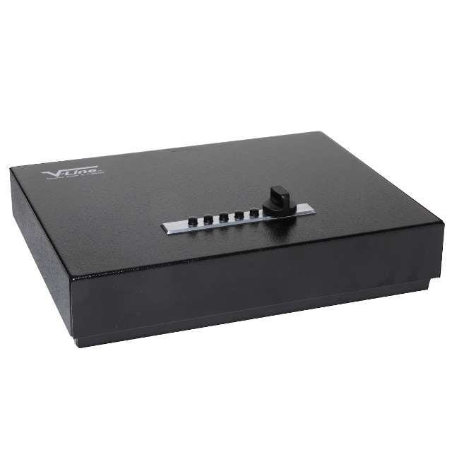 The V-Line Top Draw XD Handgun Safe with Heavy Duty Lock Cover is a compact yet rugged security solution for responsible firearm storage. Upgraded from the original Top Draw, this XD model includes a reinforced internal steel lock cover bolted into welded steel blocks, making it extremely difficult to tamper with. The top-opening design is lined with thick foam for protection, while the trusted Simplex® five-button mechanical lock ensures quick access without relying on batteries or keys. Made in the USA and California DOJ approved, the Top Draw XD delivers proven reliability at home, in the office, or while traveling.