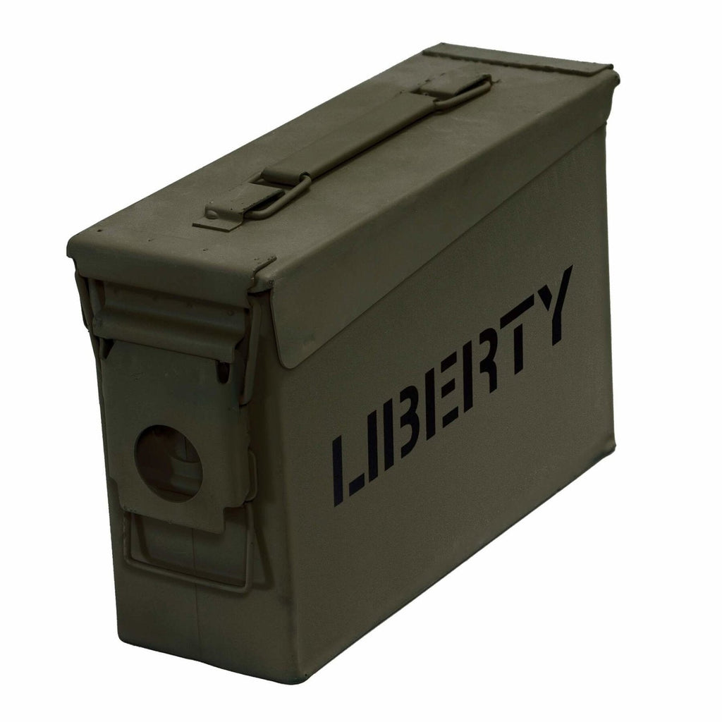 Store your ammo and other supplies in Liberty's new Ammo Canisters. Ammo lock box protects ammo and other valuables in a secure, water tight container. The metal ammo cans are in NEW condition. They are constructed out of heavy duty steel, have an air and water-tight rubber gasket, and are built to US Military Specs. OD color, locking latch, and a fold-flat top handle. "LIBERTY" lettering painted in black on the side of each military-style ammo can.